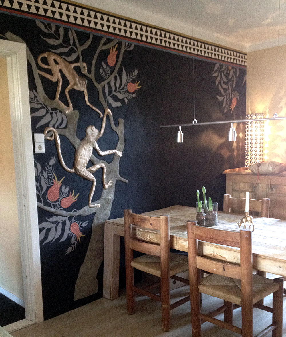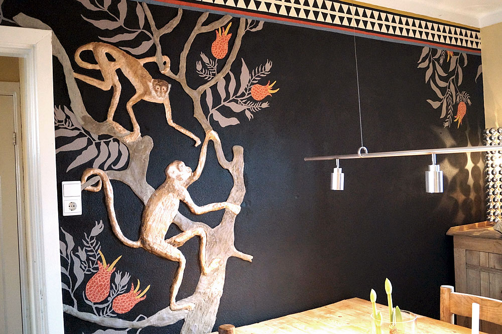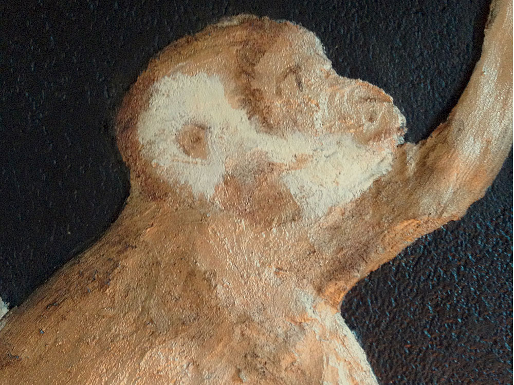 De (gouden) aapjes en de boomstam waarop ze zitten zijn gemaakt van cement en later beschilderd.