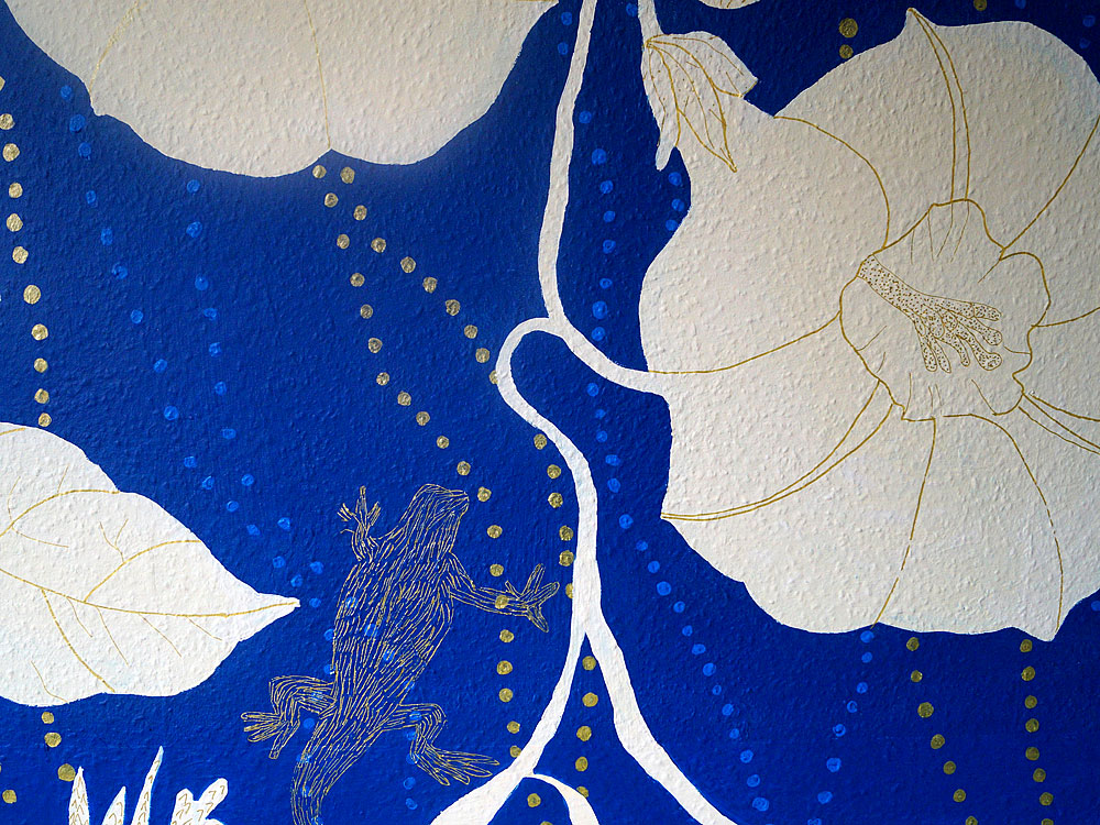 Deze helderblauwe muur met de witte bloemen, gouden stippen en de getekende gekko's is geschilderd met acrylverf.