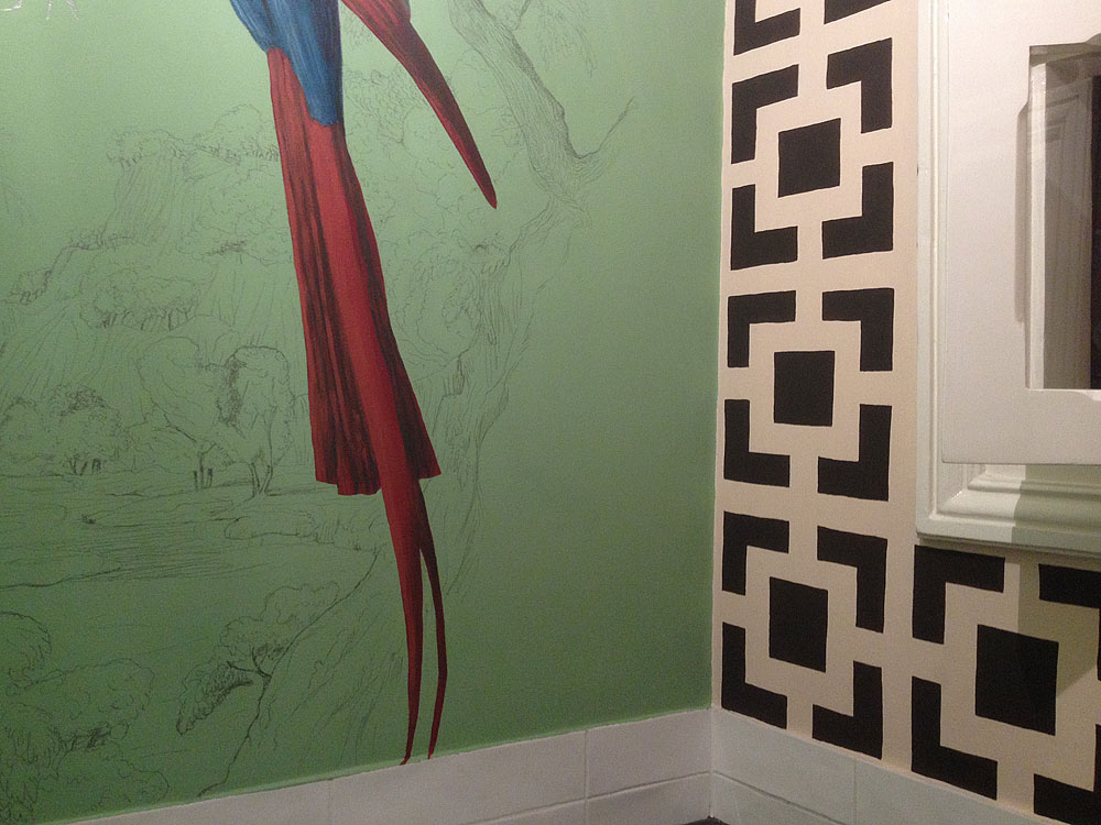 De vogel is met acrylverf geschilderd maar zijn tropisch habitat is in potlood weergegeven.