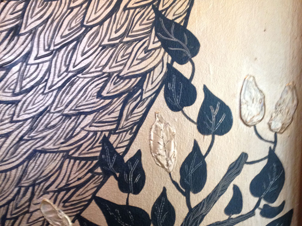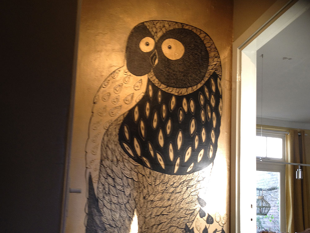 Een metershoge uil getekend met Oost-Indische inkt waarin met een naald enige details zijn gekrast.