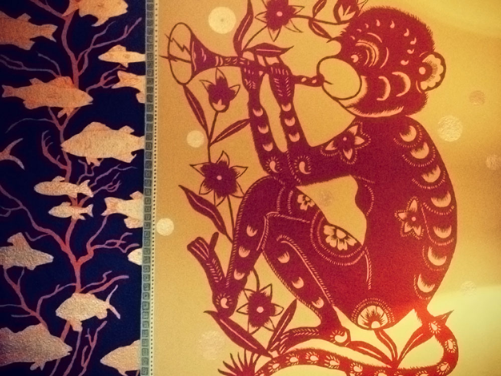 Het Chinese sterrenbeeld dat hier op de muur geschilderd is, heeft langs het kader een klein sierrandje.
