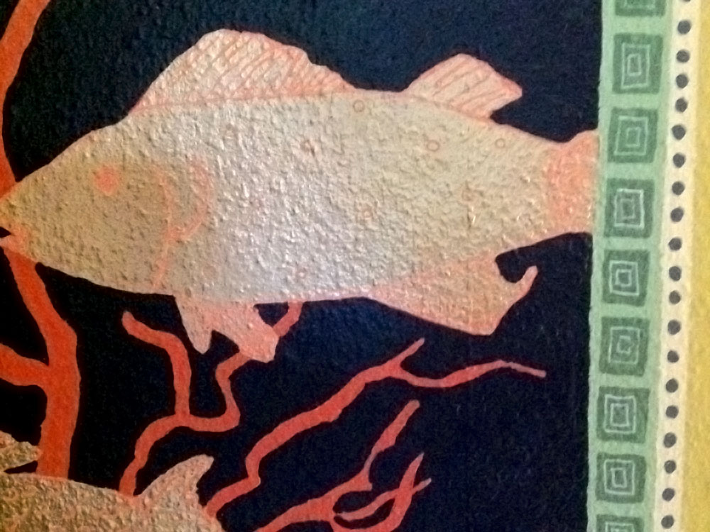 Samen met de goud geschilderde vissen en het koraal vormt het geheel een wat Oosters tafreel.