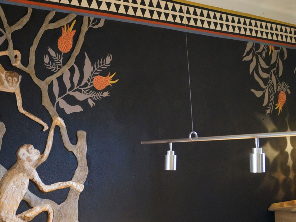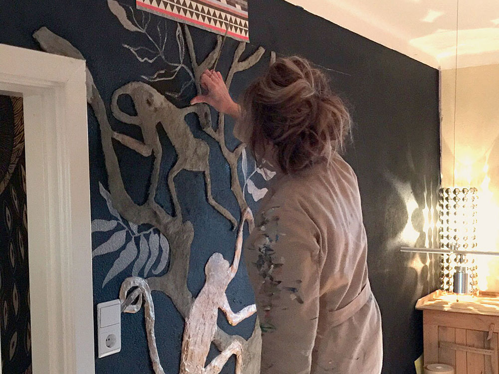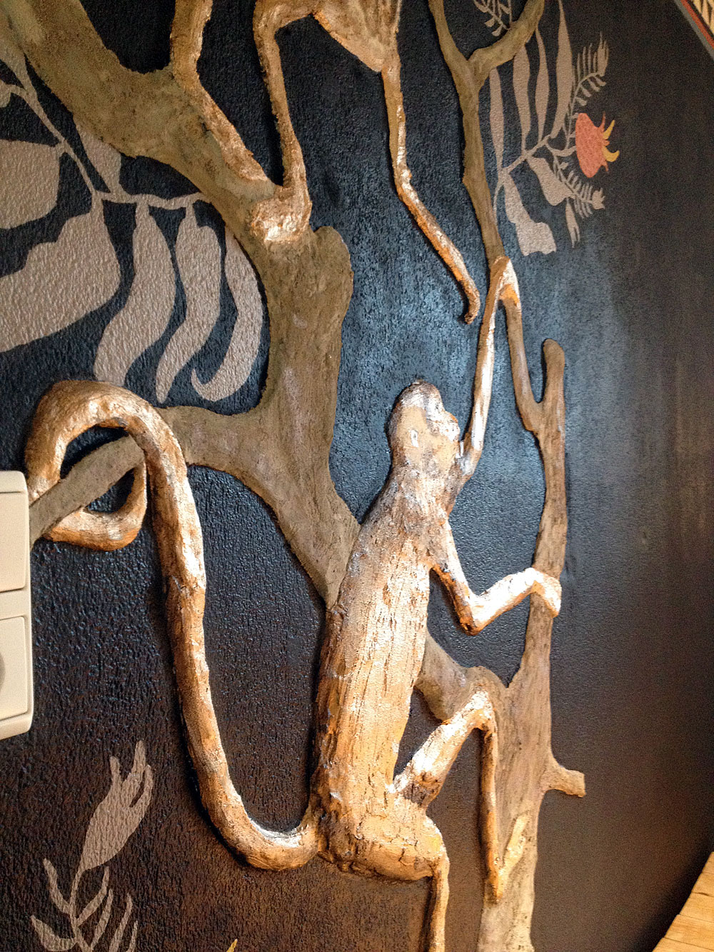 De (gouden) aapjes en de boomstam waarop ze zitten zijn gemaakt van cement en later beschilderd.