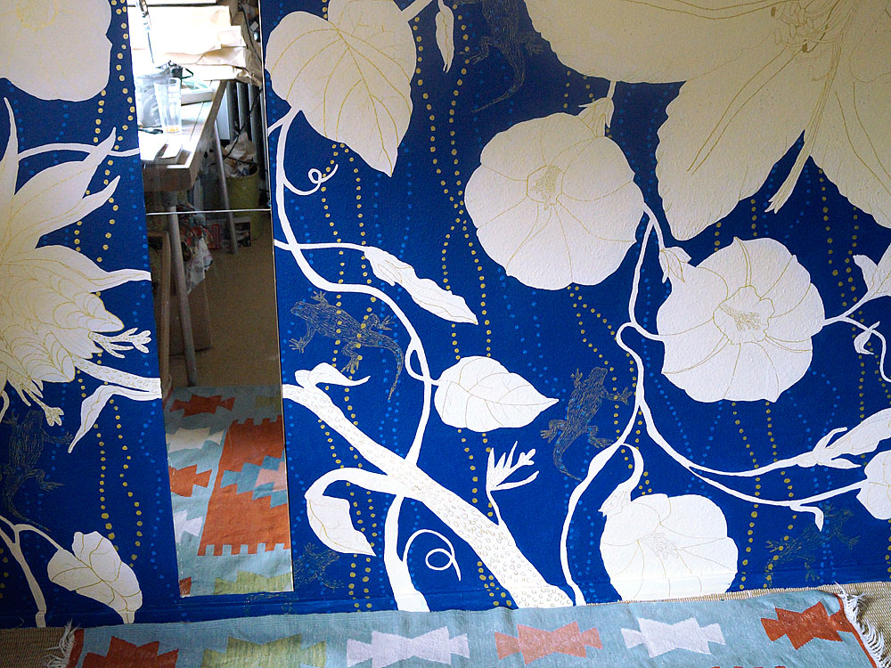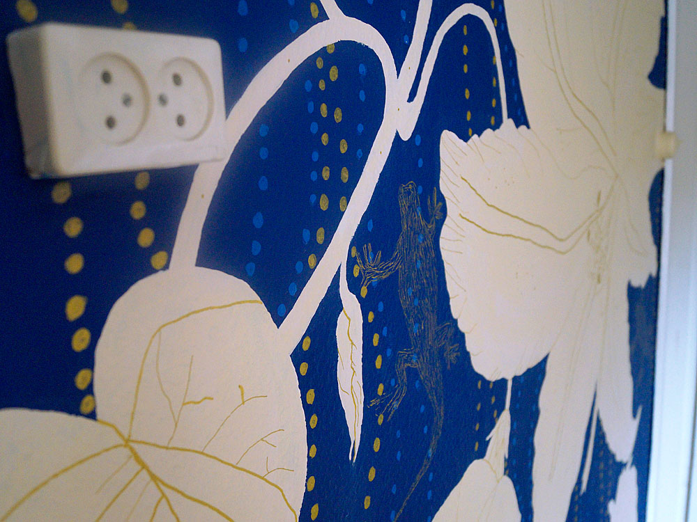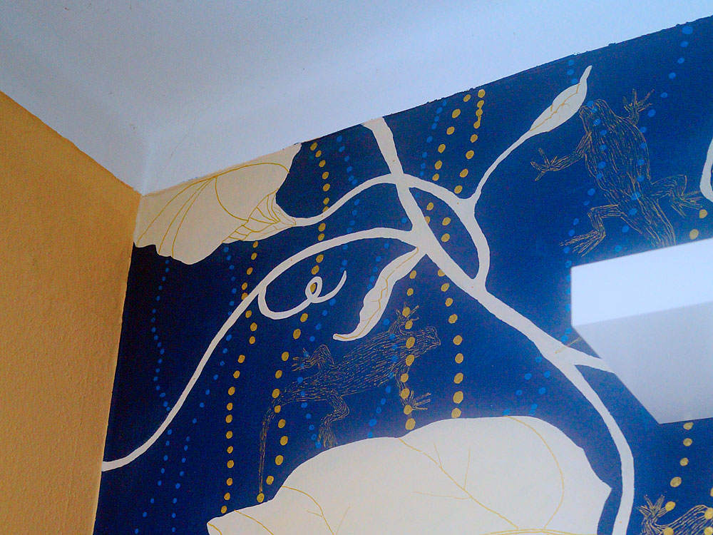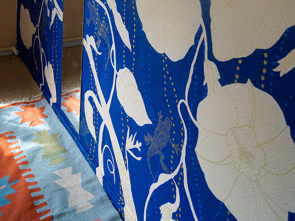 Deze helderblauwe muur met de witte bloemen, gouden stippen en de getekende gekko's is geschilderd met acrylverf.