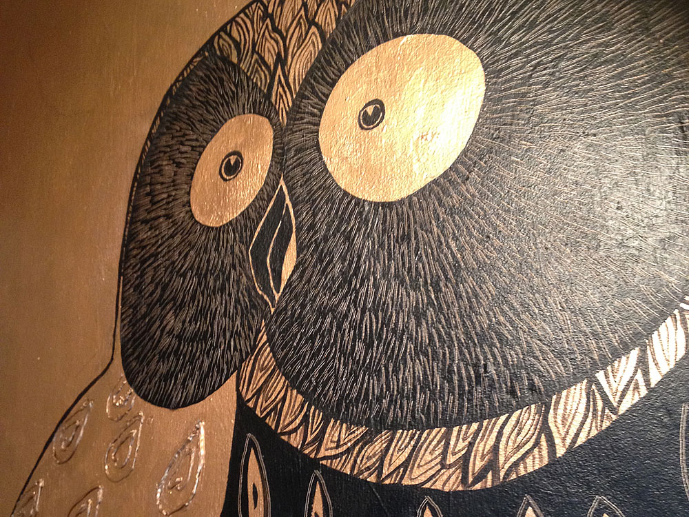 Een metershoge uil getekend met Oost-Indische inkt waarin met een naald enige details zijn gekrast.
