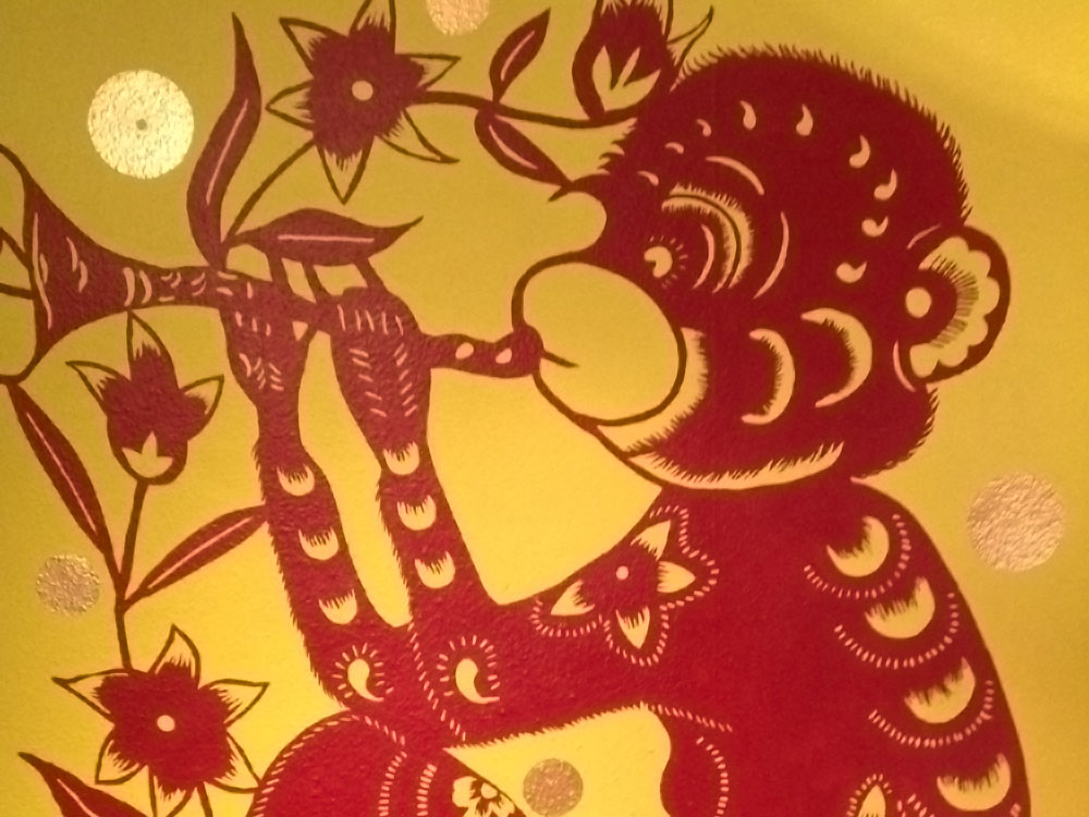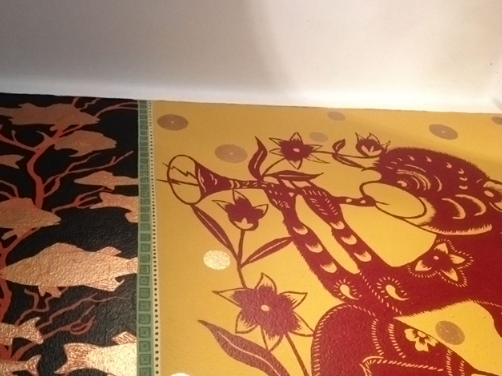 Het Chinese sterrenbeeld dat hier op de muur geschilderd is, heeft langs het kader een klein sierrandje.